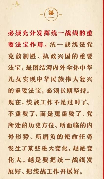1月16日出版的第2期《求是》雜志刊發(fā)習(xí)近平總書記重要文章《完整、準(zhǔn)確、全面貫徹落實(shí)關(guān)于做好新時(shí)代黨的統(tǒng)一戰(zhàn)線工作的重要思想》。在這篇重要文章中,習(xí)近平總書記充分肯定我們黨百年統(tǒng)戰(zhàn)的歷史性貢獻(xiàn)和新時(shí)代統(tǒng)戰(zhàn)工作取得的歷史性成就,用“十二個必須”對關(guān)于做好新時(shí)代黨的統(tǒng)一戰(zhàn)線工作的重要思想作出概括,強(qiáng)調(diào)關(guān)于做好新時(shí)代黨的統(tǒng)一戰(zhàn)線工作的重要思想,是黨的統(tǒng)一戰(zhàn)線百年發(fā)展史的智慧結(jié)晶,是新時(shí)代統(tǒng)戰(zhàn)工作的根本指針,全黨必須完整、準(zhǔn)確、全面貫徹落實(shí)。